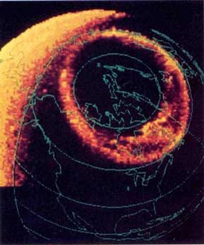 The aurora borealis, viewed near Fairbanks, Alaska; and the auroral "ring of fire" over North America, as seen from space. (Photos courtesy Malcolm Lockwood, Geophysical Institute, University of Alaska, and L.A. Frank, University of Iowa/NASA.) |