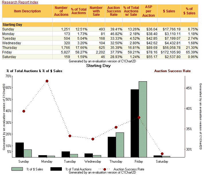 WHAT DAY of the week is best for ending eBay auctions? eBayists have been arguing about this one for years, and it seems that everyone has a answer and an angle. Now HammerTap, which was recently acquired by Bright Builders, has thrown fresh fuel on the fire with a screen shot it released in anticipation of the new version of HammerTap DeepAnalysis. The screen shot above depicts an analysis of around 10,000 eBay auctions showing nearly 60% of all eBay auction sales taking place on Fridays. This isn't too surprising in a way, if you accept the Weekend Principle, but there is one bit of unexpected information glittering in the Data Stream -- the Auction Success Rate was highest by far on Tuesdays! In fact, the Tuesday Auction Success Rate was nearly 70%, or nearly double the Friday rate.