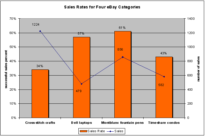 This month the eAuctionTimes.com Data Beam illuminates the sales rates of four very different eBay sub-categories: cross stitch crafts, Dell laptops, Montblanc fountain pens and Timeshare condos.