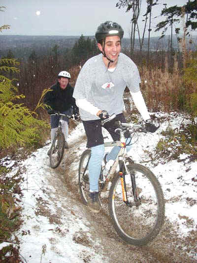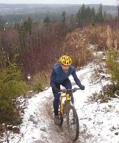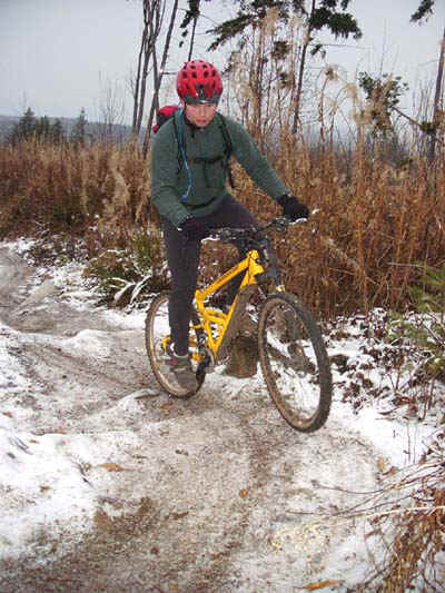 Rode Galbraith with Mark in a wet snowfall. The accumulating ice and snow made for some tricky riding in spots. The climb up the Hard Candy trail was as strenuous as I've ever seen it (the hoar frost kept collapsing under hard strokes, requiring you to sort of tip-toe up), and the hard frozen ruts were also a constant trial. Mark took a hard slam when he tried to ride a snowy log near the top of upper Arsenio. Heeding the message, I didn't try to ride the Big Rock at the top. On the way down, we absolutely flew. I used all my fastest moves, but they only kept me even with Mark, at best. He just kept pulling away in bursts, like there was a string attached to him.