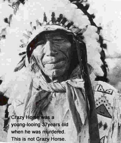 The giveaway on this bogus Crazy Horse photo is the same as Bogus Crazy Horse Photo #3: Crazy Horse "never wore a warbonnet" and was a young-looking man in his thirties when he was murdered. This elderly Indian is not Crazy Horse.
