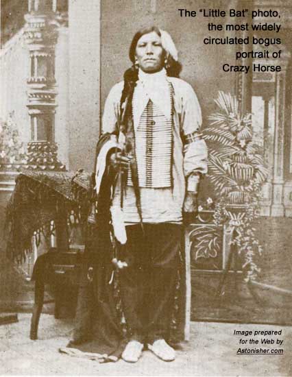 The most frequently seen bogus portrait of Crazy Horse is the "Little Bat" photo. Supposedly taken in 1877 at Fort Robinson, NE, and supposedly originally owned by Baptiste "Little Bat" Garnier, this image was first published in 1956 in J.W. Vaughn's With Crook at the Rosebud, and endorsed by Custerania author Carroll Friswold, who conveniently owned the small 2 1/2 by 3 1/2 inch tintype at the time.