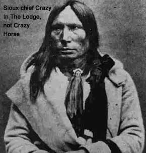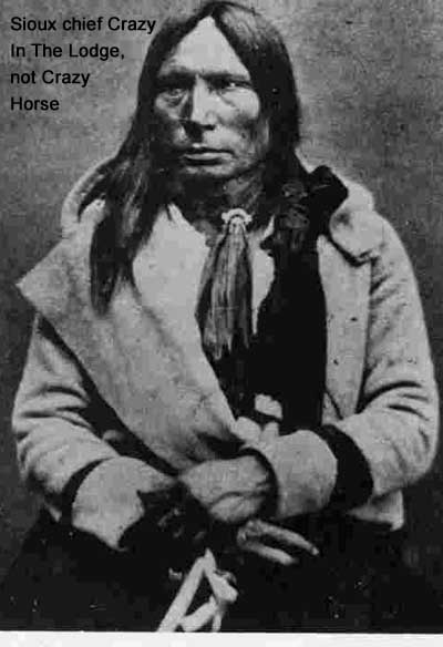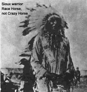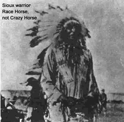 This bogus portrait of Crazy Horse purports to show the Oglala war chief at Ft. Robinson in 1876. Even if you don't know that Crazy Horse wasn't at Ft. Robinson in 1876 (he didn't surrender until May 1877), this is clearly not Crazy Horse either. There are two giveaways here. The first is his head gear: a rare point of agreement among people who knew Crazy Horse is that he never wore an eagle feather war bonnet. The second is the age of this unknown Indian, who is at least middle aged, while Crazy Horse was by most accounts a young-looking 36 or 37 at the time of his death. This Indian is sometimes identified as Race Horse, a purported cousin of Crazy Horse.