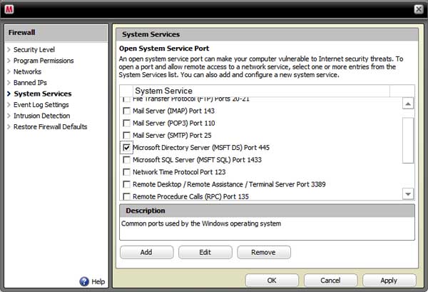 Norton 360 users need to do the same. In Norton 360, click Task and Settings > Change Advanced Settings > Firewall Protection Settings > Network Location. Check to see if your network location (numerical IP) is listed as Limited. If it is, change it to Trusted. Norton 360 users may also have to open ports 137-139 and 445 Windows File Sharing and Windows Directory Server respectively, as discussed for McAfee Security Center above.