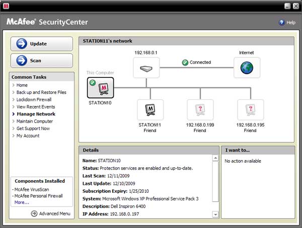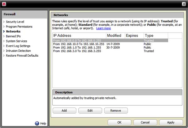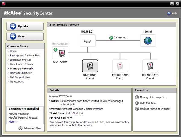 Still in McAfee Security Center, click one of the machines on your network or your router (see screenshot below) to see the numerical IP range used by your home network. Note the numerical IP of the machine (last item in info box at the bottom of the screen). Now go back to Security Center Home and click Firewall > Networks. Make sure the numerical IP you just noted is within the range of one of the "Trusted" IP's on the IP Address List. Change the IP to to Trusted if it isn't designated that way. |
