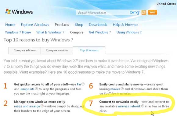 So how's that for the "easy" wireless network setup Microsoft promised in its glossy advertisements? Here's another screenshot from Microsoft.com. It claims that Windows 7 enables you to "view and connect to any available wireless network in as few as three clicks." I haven't done a complete count of the actual, real world Windows 7 / Windows XP network setup procedures outlined above, but the actual number of clicks required to set up peer-to-peer networking between Windows 7 and the rest of the Windows world can be closer to 300 clicks than three! -- Bruce Brown P.S. If you still can't get your Windows 7 and Windows XP machines to get it together on your wireless home network, click here... Deceptive advertising by Microsoft for Windows 7 -- Microsoft claims Windows 7 let you "connect to networks easily -- view and connect to any available wireless network in as few as three clicks" (circled in screen shot ABOVE). As this article demonstrates, it takes closer to 300 clicks to connect a Windows 7 Home Premium PC to a Windows XP Pro computer, the most common networking environment in which Windows 7 users will find themselves. What to do if the #$@&* machines still won't network... IF YOU still can't get your Windows 7 and Windows XP machines to connect on your wireless home network after following the Nine-Step Checklist, there are a couple more things you can try. If you have McAfee Security Center installed, go to the main screen, click Manage Network (in the list on left), then click the icon for the Windows 7 PC you're trying to network with. If it's status is listed as Managed, change it to Unmanaged (or vice versa -- the toggle is in the lower right hand corner of the screen), then rebbot and try to browse the other machine with Windows Explorer again. You can also try connecting the Windows 7 and Windows XP machines via numerical IP. If you have McAfee Security Center, go Manage Network. There you'll see the IP for your router, which defines the IP range that your home network uses. If you highlight the computer(s) on the wireless network -- including the one you're on -- you'll see the numerical IP for that machine. If you don't have a program like McAfee Security Center to reveal the numerical IP's to you, you can get each machine's numerical IP by opening a DOS box, typing "ipconfig" (without the quotation marks) at the DOS prompt and hitting Enter, as detailed in this video for Windows Vista (works pretty much the same in XP and Win7). Now go Start > Run (on XP) or Start > Search box (Win7), type //191.168.1.197 (replace this number with the numerical IP of the machine you want to network with) and hit Enter. If that works, you can use that address in your shortcuts, etc., but you also know you've got a problem in your TCP/IP which needs looking at. If you're still getting error code 0x80070035, it could be that NETBIOS isn't enabled over TCP/IP in Windows. Here's a Microsoft Knowledge Base article that addresses this sweet possibility. -- B.B.