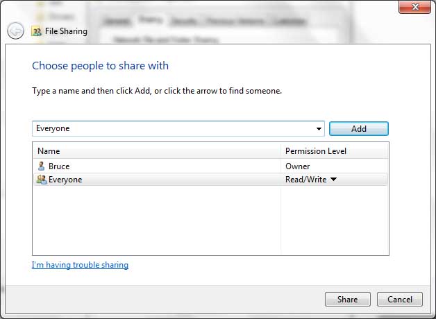 File sharing in Windows 7 (ABOVE)-- In Windows Explorer (as opposed to Control Panel, as in the screenshots ABOVE) When you left-click on a folder > Properties, these are the General and Sharing Tabs (TOP LEFT & RIGHT). The Share button on the Sharing Tab gets you to the LOWER screenshot, where you must enter "Everyone" (without quotation marks) as a group and assign the level of access you want. |