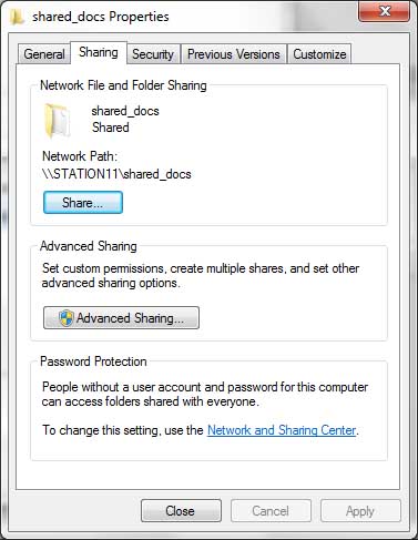 Open Windows Explorer, navigate to the folder on your Win7 machine that you want to share on the network and right-click it. Go Properties > Sharing Tab > Advanced Sharing > Share this folder > click Apply and OK > Close. (See screenshots below.) |