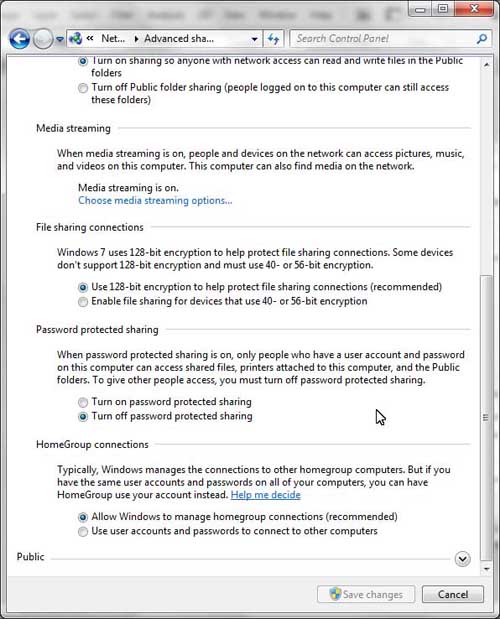 Now go to your Windows 7 machine. Click Start > Control Panel > All Control Panel Items > Network and Sharing Center > Change Advanced Sharing Settings (the location of this button is a little obscure -- it's near the top of the blue bar on the left in the column headed, "Control Panel Home" -- see pics below) and make sure you have Network Discovery, File and Printer Sharing and Public Folder Sharing all set to "On," and Password Protected Sharing to "Off" (again, see screen shots of settings below). |