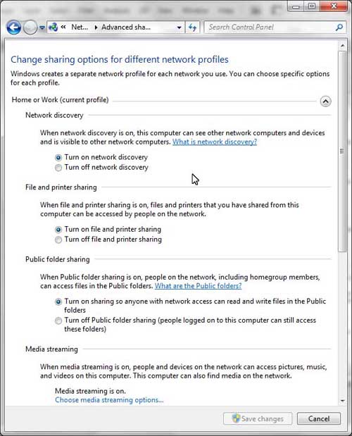 File sharing in Windows 7 (ABOVE)-- Here are the control screens for file and printer sharing in Windows 7. These are the settings to allow file and print sharing on a peer-to-peer network.. |