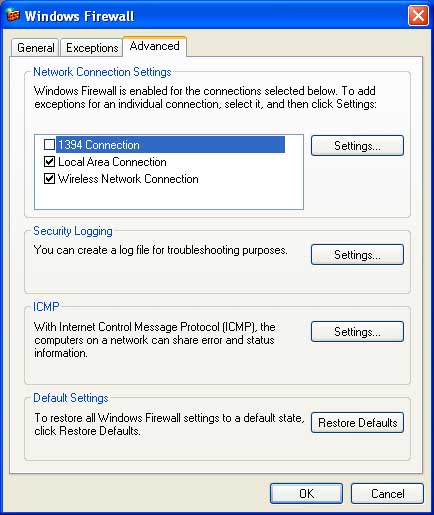 Configuring Windows Firewall in Windows XP to allow wireless network traffic -- go to Control Panel > Security Center > Windows Firewall. On the General Tab (ABOVE RIGHT) turn Windows Firewall ON. Then go to the Advanced Tab and uncheck the box next to "1394 Connection." |