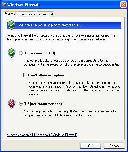 Start with the Windows Firewall on your Windows XP machine. Go to Control Panel > Security Center > Windows Firewall > General Tab. On the General Tab there is a toggle that turns the Windows Firewall On and Off (see screen shots below). Now turn off your McAfee Security Center or Norton 360 firewall. In McAfee Security Center, click on Internet and Network in the main pane, then Configure toward the bottom right of the screen. Click Off in the top heading under Internet & Network Configuration, called "Firewall protection is enabled" (see screenshot below). Turning Off your Windows Windows XP firewall -- In Windows XP, go to Control Panel > Security Center > Windows Firewall. The General Tab shown in the screenshot above shows the Windows Firewall turned Off. |