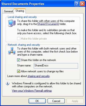 First go to your Windows XP machine and open Windows Explorer -- Start > All Programs > Assecories. Steer in Windows Explorer to the folder(s) you want to share. Right-click on the folder and choose Sharing & Security > Sharing tab. Tick "Share this folder on the network" and/or "Allow users to change my files," depending on the level of sharing you want to grant, and click OK. Now the icon for the folder you just shared shows a hand super-imposed on the lower portion, indicating it is a shared folder (see screen shot below). |