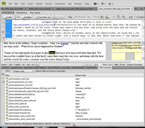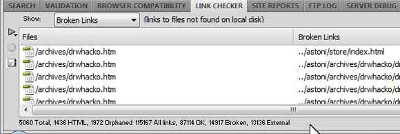 Longtime GoLive users will be pleased to see that Dreamweaver acts much like GoLive in this process. Dreamweaver even has something similar to GoLive's "Point And Shoot Button," which is available on the main Properties Inspector in Dreamweaver. (Unfortunately, however, Dreamweaver lacks this useful GoLive feature when it comes to changing links globally.) Don't be surprised, though, if there are a lot of broken links when you first open your converted Golive Web in Dreamweaver. When I converted Astonisher.com with the Adobe GoLive Migration Tool, it came into Dreamweaver with 15,000 broken links out of a total of 115,000 links (see screenshot above).