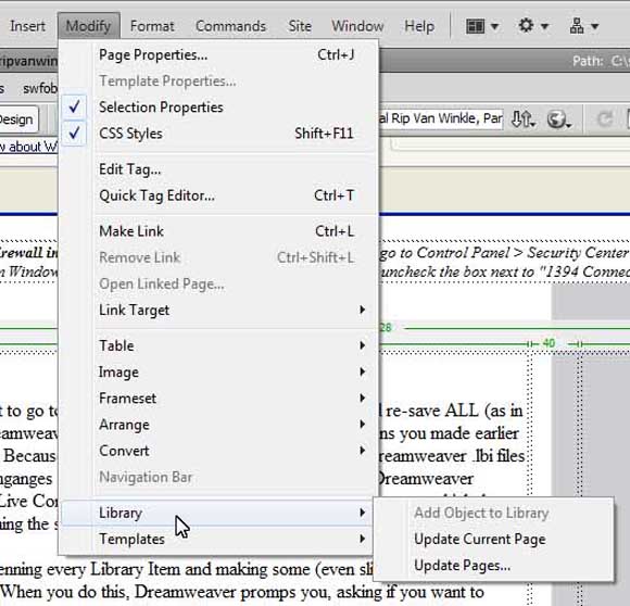 You need to Update Pages! You can update the Library Items on an individual Page by opening the page in question, then going Modify > Library > Update Page. You can also update all the pages in the site from the same menu tree (see screen shots above and below). Sounds fairly slick and easy, but FYI I found that I eventually had to open, manually modify and re-save every single Library file, which on Astonisher.com totaled 198.
