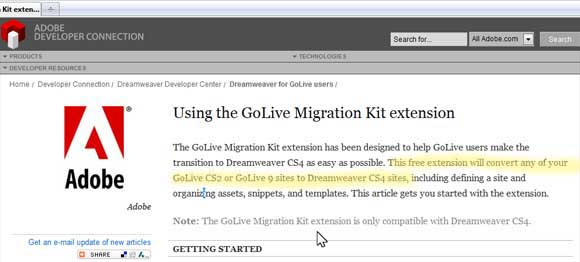 Of course, this confidence simply may have been bought at the price of ignoring the whole issue of migrating GoLive Components into Dreamweaver, since there is no mention of them in Adobe's discussion of "manually migrating" GoLive to Dreamweaver. By October 15, 2008, though, Adobe was waveringly, essentially admitting that most GoLive users couldn't take advantage of the Adobe GoLive Migration Tool without providing any useful solution. At the bottom of Using the GoLive Migration Kit extension, Adobe lamely suggests: