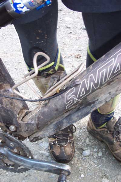 | HERE'S A snapshot of a Santa Cruz Superlight that Mark Adriance broke on November 12, 2004. The bike began making some odd cracks and pings toward the end of a robust three-hour ride, and when Mark got to the bottom he discovered the down tube had broken and severed almost all the way around. There was only about a quarter inch of good tube left holding it together. The break shows in this photo as a white line through the "S" and the "A" in Santa Cruz.