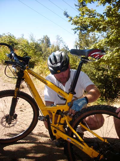 Chris Christiansen makes a couple adjustments to his Cannondale Jekyll on the Ridge Trail... |