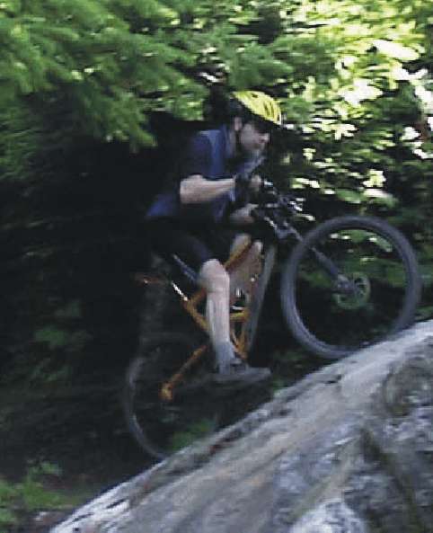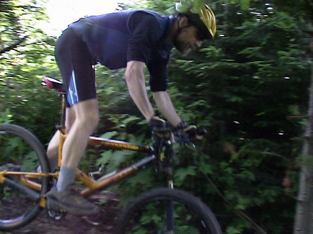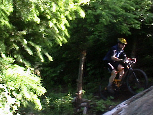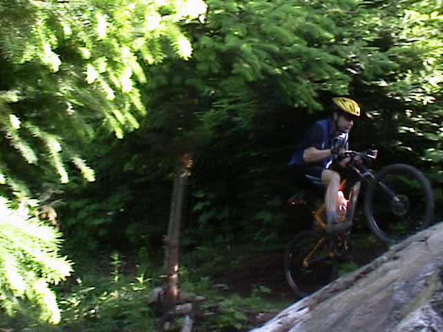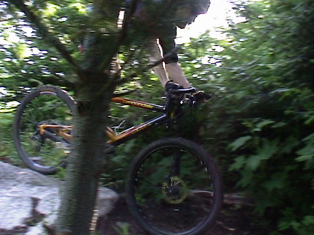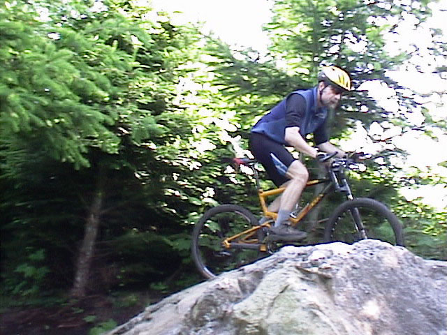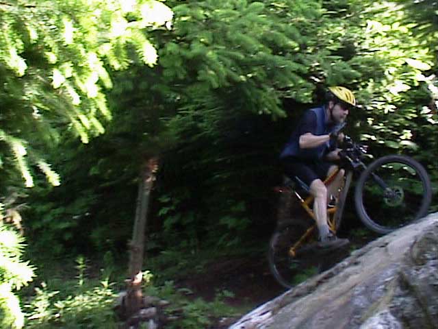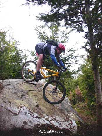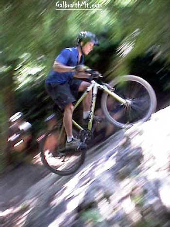 Tom Aeschliman, who built the trail with the notorious Bob Torset, made marvelous use of the natural terrain, and nowhere better than the Little Rock. Of the two lines off the rock, the right one is steeper but shorter -- "only" about head-high. It requires the rider to put his bike in an almost vertical position, but the run out is mercifully steep and straight. The right line is the easier of the two and can be ridden sight unseen by an expert trail rider. The left line is something else. It is nearly twice as high with a drop at the bottom of the rock. Yo mama! To further complicate matters, the approach and exit lines aren't straight or particularly accommodating.The left line can be ridden, though, as Mark Belles demonstrates here. Notice how he picks up his line with a hard right at the top of the rock, and then angles right to left across the face to minimize the drop at the bottom. There is a fair amount of compression when you come off the rock and hit the flat ground beyond. In fact, this is the last time the Belles rode his yellow Cannondale Jekyll. He broke the frame, and is now riding a Santa Cruz Superlight. CLIMBING THE Little Rock is an exhilarating experience too. There is a nice, fast run up that allows you to carry speed to the rock face. You can roll right up the base of the rock, but riding a bit of a manual allows you to leap onto the granite, which gives good traction, even with narrow semi-slicks. Strong climbers like to attack the run up to the face in the fourth or fifth cog in the back, and then downshift as they jump a wheelie onto the rock. Says noted Galbraith climber, Mongo, "I think -- 'three strokes and I'm up.' I imagine I'm a bird in an updraft, and just think about my upstroke. "You better be ready to attack, though. You want to make it. You do NOT want to run out of gas just short of the top." He smiled like River Phoenix. CLIMBING THE OTHER line on the rock, the so called K2 Face on the left which Belles is seen riding down in the pictures above, is one of the toughest technical climbing challenges on Galbraith. In fact, when you stand at the bottom and look up at it, you may be tempted to think that it can't be done. But it can be done! The first trick for the steep line, as Jason Ploskuniak demonstrates in the photo above, is to get up a ton of speed. Before the climb pictured above Jason went so far back down Cedar Dust that he couldn't even hear us yelling at him. Then he started out and sprinted hard at the the rock wall, maybe a dozen turns in the trail ahead. By the time the Little Rock swung into his view, he was doing an honest 15 mph, which is flat out flying in a tight, twisty single track situation. He never slowed or waivered at all. He just threw himself at the wall and powered straight up and over it with his signature Kona hard tail. Piece of cake for Jason, the Bike God of Glacier. Chris Hardin said he couldn't quite get over the top until he started steering to his left at the top. This is the exact reverse of the line Mark Belles is pictured descending in the action sequence above. Of course, a few challenges still remain on the K2 Face. As Chris Hardin observed, "no one's climbed it yet when the rock is wet." And if this isn't enough, there's always the Big Rock. If you are crazy enough to try riding the Little Rock on Cedar Dust, please wear a good helmet, have your medical insurance paid up, and deploy at least two spotters to catch you if you don't make it and fall backwards onto the rock. And remember, GalbraithMt.com recommends scouting every stunt and obstacle before trying to ride it. See GalbraithMt.com Cedar Dust Trail Guide for more info on Cedar Dust. Click here for video clip. Click here for more GalbraithMt.com Technical Notes. Up and over -- Mongo climbing the "easy" face on the Little Rock.