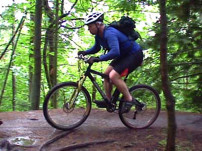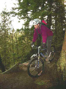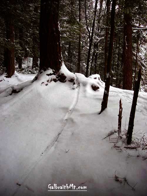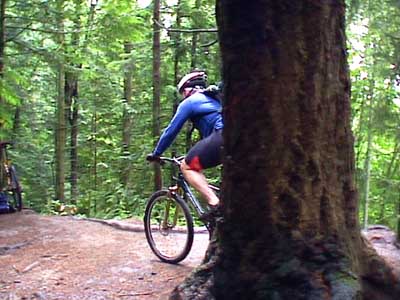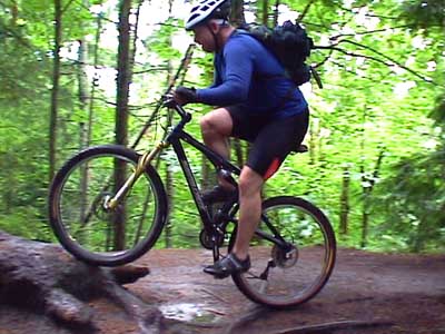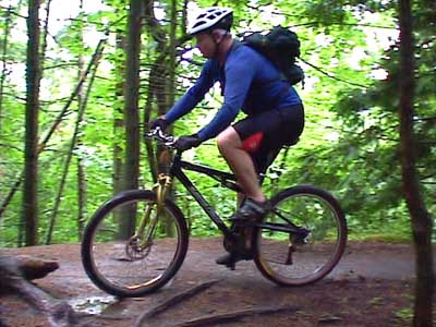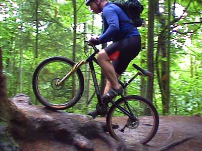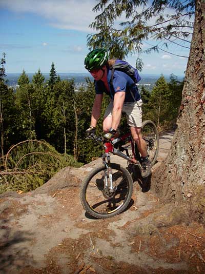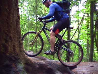 Comprised of large, exposed Doug fir roots on top of bedrock at the edge of a cliff on the lower Ridge Trail, it forces the rider to the edge of the drop where you seriously don't want to make a mistake, body armor or no. There are a dozen or more lines over the root fan that radiates out from the grand old fir, but the hardest and most technically demanding is the one where the riders drives straight at the cliff, than makes an abrupt left turn and dives up over the Big Gnarly in close to the right side of the tree, where you can roll your front wheel up a fork in the roots. There is a slightly easier line further out from the trunk, but you have to be willing to ride that much closer to the edge. Some of the lines on the left are somewhat easier, but not all of them, especially in close to the trunk of the tree. If you are going to try to ride the Big Gnarly, please wear a good helmet, have your medical insurance paid up, and deploy a spotter to catch you if you fall toward the cliff. And remember, GalbraithMt.com recommends scouting every stunt and obstacle before trying to ride it. See GalbraithMt.com Ridge Trail Guide for more info on the Ridge Trail. Click here for more GalbraithMt.com technical notes. The following are sequence shots of the stunt. Click on the thumbnail images to view a larger version...