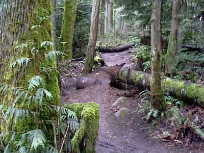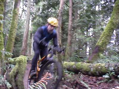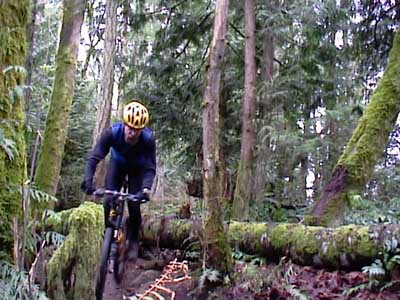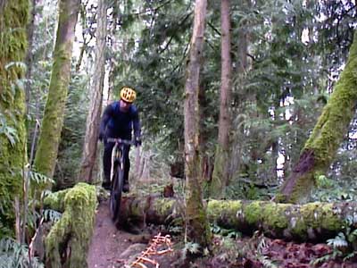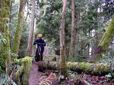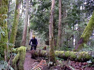 | IF YOU haven't ridden the Ridge Trial lately, you may be interested to know that there is a new drop on the lower Ridge Trail where the singletrack used to squeeze between two fir trees. This spot used to be particularly challenging on the descent since it was barely wider than most riders' handlebars, and required a steady hand and sharp eye at speed.