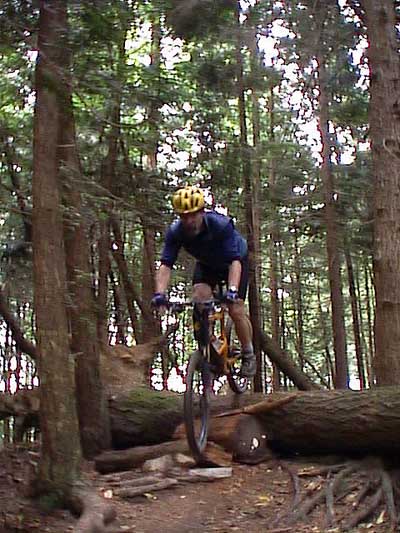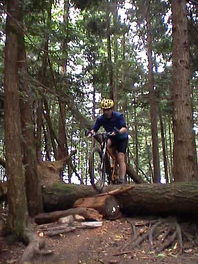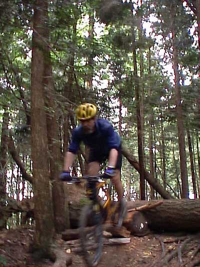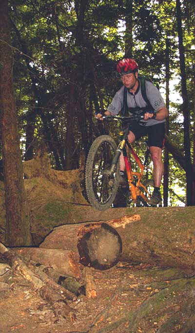 HOW MANY TIMES have you ridden right by Big Log Candy, the sweet diversion along the side of the upper Ridge Trail right after it ducks into the cool shade of the trees? It's on the right side of the trail as you head down, and it can look fairly scary if you're not an expert rider or you've never seen it before. Truth is, it's not as bad as it looks -- and certainly not as bad as some other log rollovers on the mountain (e.g., the Bad Boy on Dan's Trail). Why? Well, for one thing, the approach to Big Log Candy is straight and uncomplicated, allowing you to carry enough speed to get to the apex of the log without waivering. Also, the back side is relatively benign, providing a straightforward (albeit very steep) ramp back down to terre firma. You do get a WAYS up in the air when you're on top of the big old Doug fir log that anchors the rollover, so you don't want to blow it. Hurling off the high side of this sucker is not a pretty thing to think about, but if you're prepared, it can be a lot of fun to ride. So how do you prepare? Obviously, the first thing you do is work up to it, starting with smaller rollovers and drops until you know how to punch up over a log, and how to go off the back of the saddle on steep descents. Next, you figure out the best line. As always, you should scout the line ahead of time for yourself, but the line you want to ride pretty much follows the angle of the log ramps up and down, which is generally right to left. You definitely want to be angling to the left as you come down, because you'll hit a tree if you don't. Please note too that the logs and branches in the ramp down can be loose. OK, YOU'RE heading down the Ridge Trail approaching Big Log Candy, and you think you'll try it. Now take your hands off your brakes. No kidding. You've got to really commit to riding Big Log Candy if you're going to have any chance of actually making it. And taking your hands off the brakes forces you to commit. You can still get to the brakes if you really need them, but if your fingers aren't quivering on the levers, your first impulse will be to try harder, not bail. Taking your hands off the brakes makes it less likely you'll freeze when you get to the top and look down the steep log ramp (it is a thrilling view). It also makes it easier for you to do the right thing coming down the backside, which is to get your weight back and let 'em roll. You definitely don't want to touch the brakes until both your tires are kissing the dirt again. (And then, of course, you want to brake enough to make the corner that follows.) If you are crazy enough to try Big Log Candy, please wear a good helmet, have your medical insurance paid up, and remember, GalbraithMt.com recommends scouting every stunt and obstacle before trying to ride it. See GalbraithMt.com Ridge Trail Guide for more info on the Ridge Trail. Click here for more GalbraithMt.com technical notes. The following are sequence shots of the stunt. Click on the thumbnail images to view a larger version... Rolling over Big Log Candy -- note the loose stuff on the ramp down.